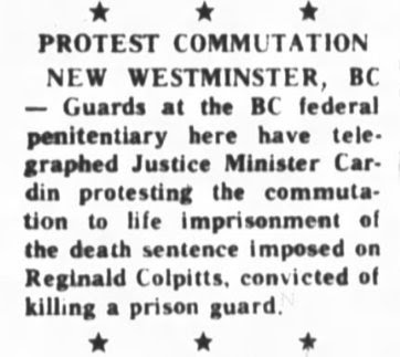 I next find out that Reginald John Colpitts had been transferred to the B.C. Penitentiary in the following newspaper article.